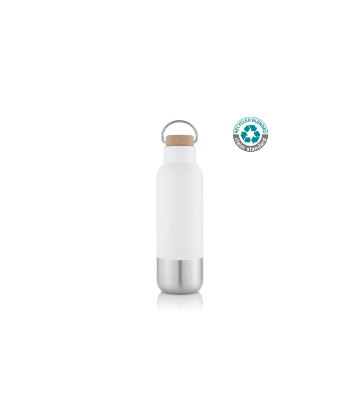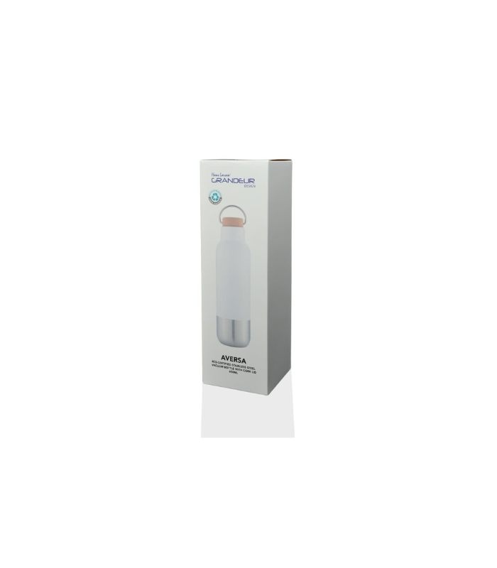 Aversa is a 22oz Premium Double Walled Vacuum Insulated RCS-certified Recycled Stainless Steel water bottle with a cork lid. Sustainable at its core, Aversa is made from 83% RCS-certified recycled stainless steel, 2% cork and remaining 15% from iron alloy and PP materials. Includes a leak-proof cork lid with carry handle. Uses durable SS-304 grade stainless steel inside and outside for long term corrosion resistance. Packed in a gift box. Content: 650ml