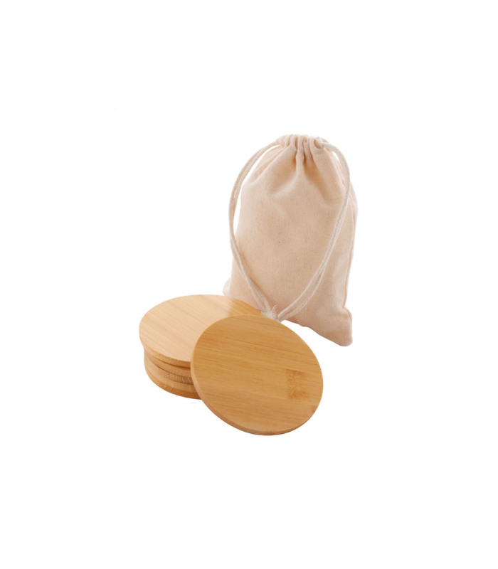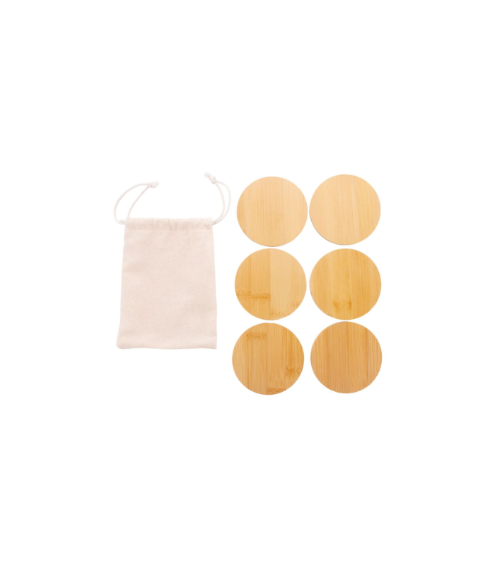 Set of 6 circular natural bamboo coasters, each measuring 8.5 cm in diameter and 0.5 cm in thickness. Packed in a cotton drawstring pouch