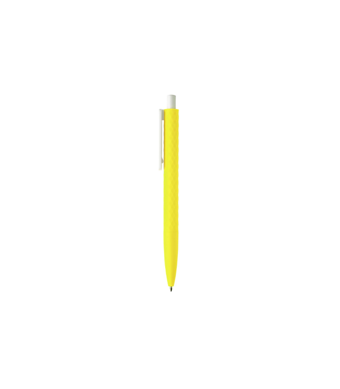 Soft touch (rubberized finish) plastic pen with geometric design. Blue ink.