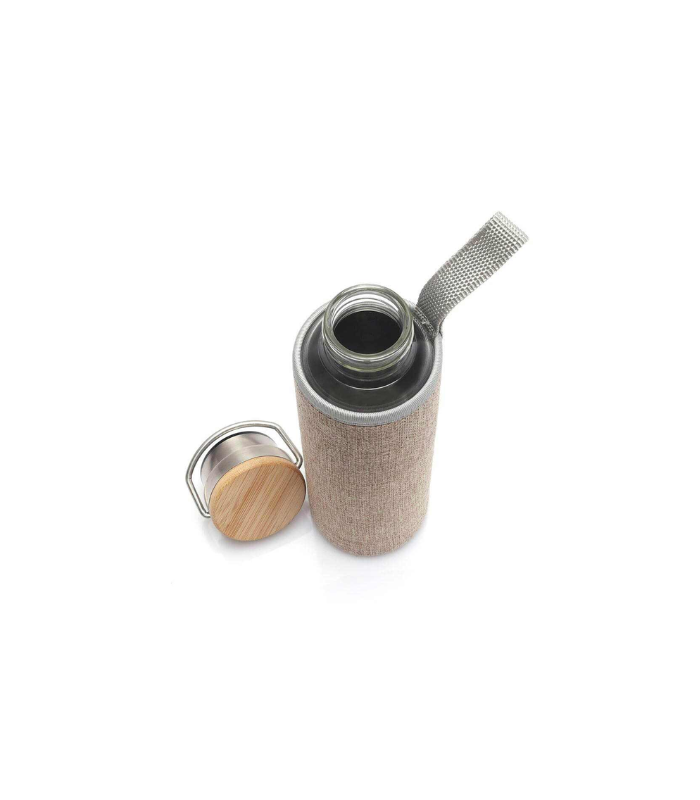 Floha is a borosilicate glass bottle with a bamboo lid + handle, with a jute sleeve. Capacity: 500ml