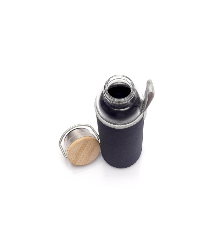 Floha is a borosilicate glass bottle with a bamboo lid + handle, with a color sleeve. Capacity: 500ml