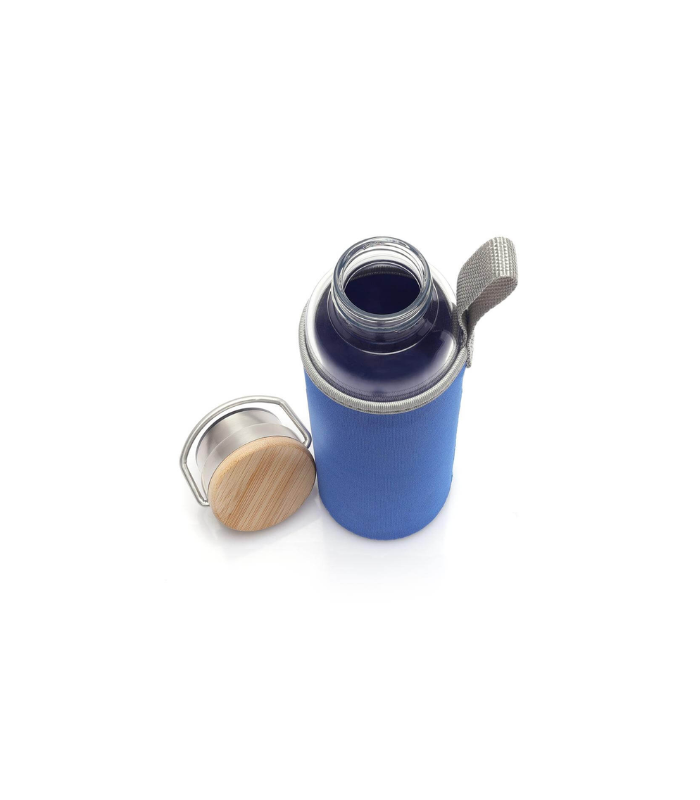 Floha is a borosilicate glass bottle with a bamboo lid + handle, with a color sleeve. Capacity: 500ml