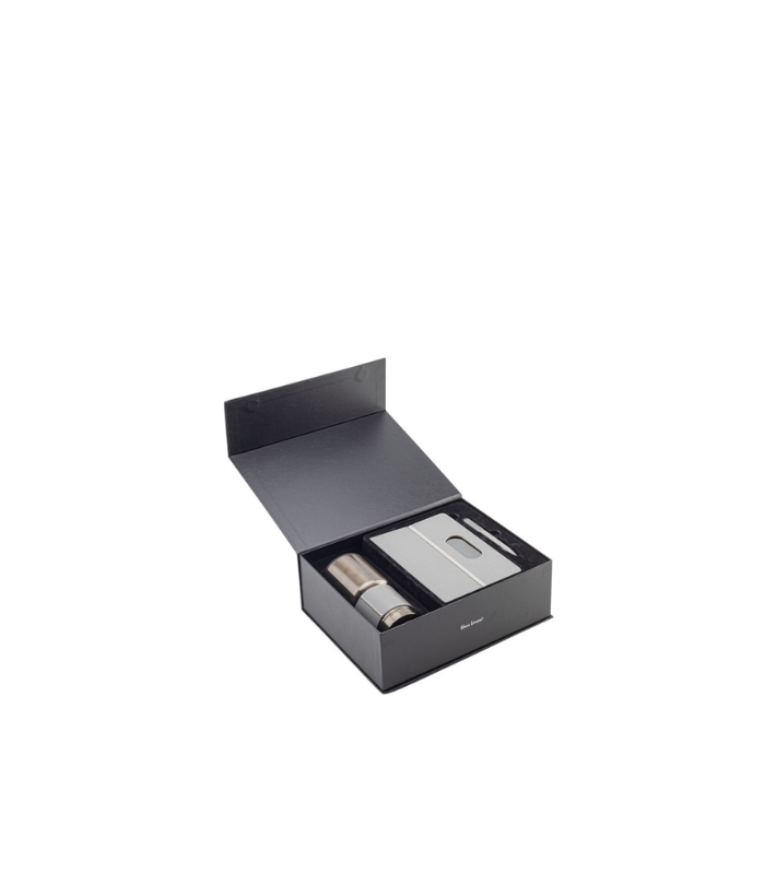 This premium set includes a PU hardcover notebook, a twist-action ballpoint pen, and a 530ml stainless steel mug – all with matching PU material and gun metal accents. The notebook features a sleek gun-grey metal plate on the cover and contains 160 pages of smooth 70gsm paper. The twist-action pen boasts a durable metal barrel with a matching gun-grey clip and plate, and writes in blue ink. The double-walled stainless steel mug is designed with a black PP lid, a gun-grey metal plate, and a protective sleeve for comfortable gripping while drinking. The gift set is presented in a premium magnetic gift box with tray inside.