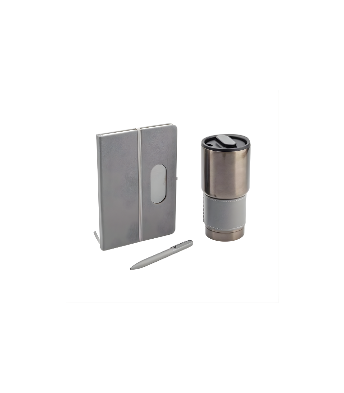 This premium set includes a PU hardcover notebook, a twist-action ballpoint pen, and a 530ml stainless steel mug – all with matching PU material and gun metal accents. The notebook features a sleek gun-grey metal plate on the cover and contains 160 pages of smooth 70gsm paper. The twist-action pen boasts a durable metal barrel with a matching gun-grey clip and plate, and writes in blue ink. The double-walled stainless steel mug is designed with a black PP lid, a gun-grey metal plate, and a protective sleeve for comfortable gripping while drinking. The gift set is presented in a premium magnetic gift box with tray inside.