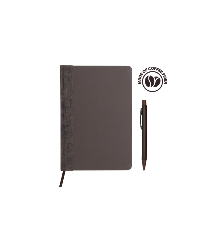 Helsinki is a set of A5 Hard Cover Notebook made with coffee fiber cover and 192 pages of coffee colored recycled paper, and a ballpoint pen with barrel made from 40% coffee fiber material. Coffee fiber is a circular material made from waste generated in coffee cultivation.