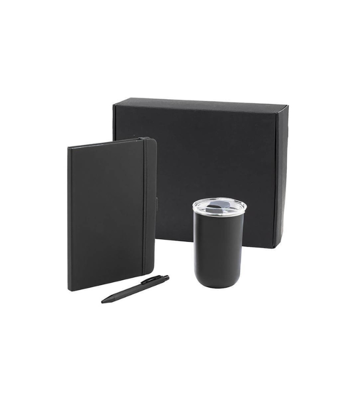 A refined trio gift set featuring a double-wall tumbler, A5 notebook, and a sleek pen for smooth writing. The 300ml tumbler features an inner wall made of high-grade SS304 stainless steel and a durable PP outer wall for lasting use. The A5 notebook includes 192 ruled pages of 70gsm paper, while the smooth-writing push-action pen ensures effortless everyday writing. Packed in a paper gift box