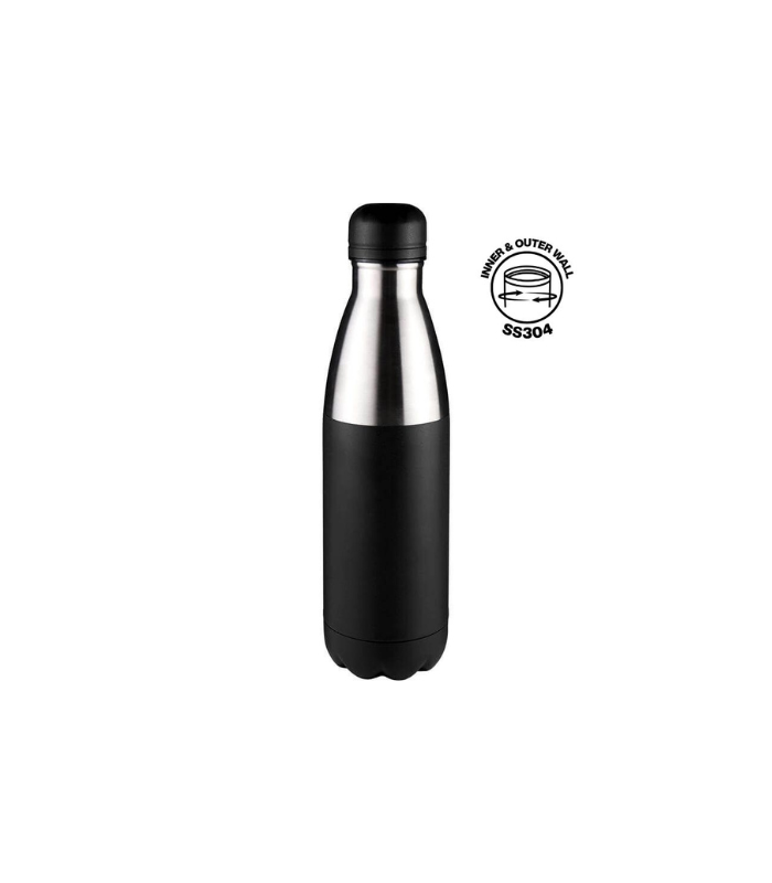 Classic double walled vacuum insulated water bottle with corrosion-resistant 304 Grade Stainless Steel for both inside and outside walls. Unique half-coating provides an elegant look and powder coated for stone-touch feel. Leakproof. Maintains drinks hot for 6 hours, and cold up to 12 hours. Content: 500ml