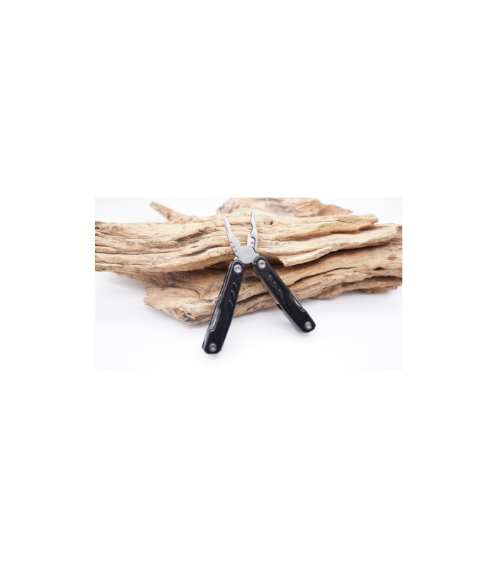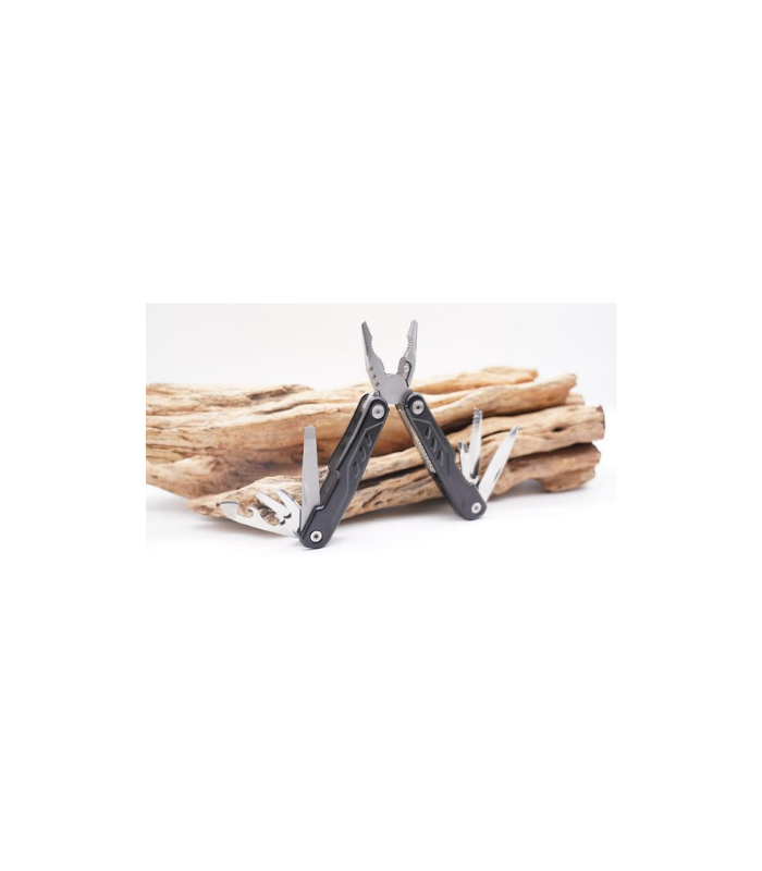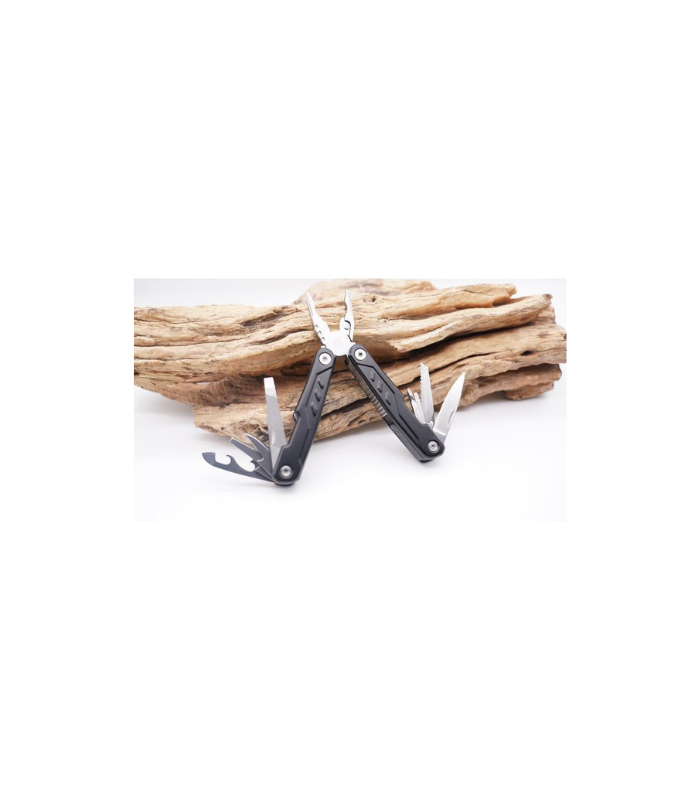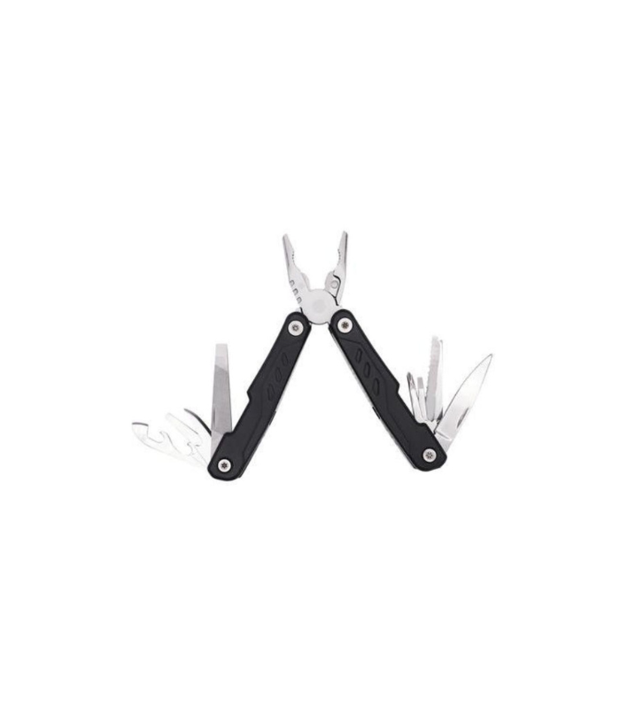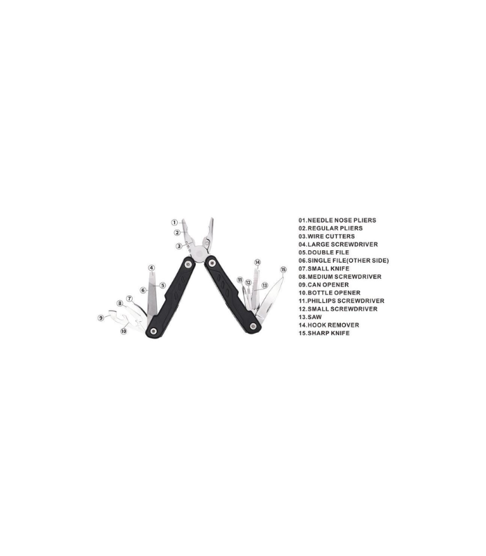 Kitee is a premium stainless steel multi-tool with 15 function tools including: needle nose pliers, regular pliers, wire cutters, large, medium & small screwdrivers, double file, single file, small knife, medium screwdriver, can opener, bottle opener, phillips screwdriver, saw, hook remover, and sharp knife. Packed in a carry pouch.