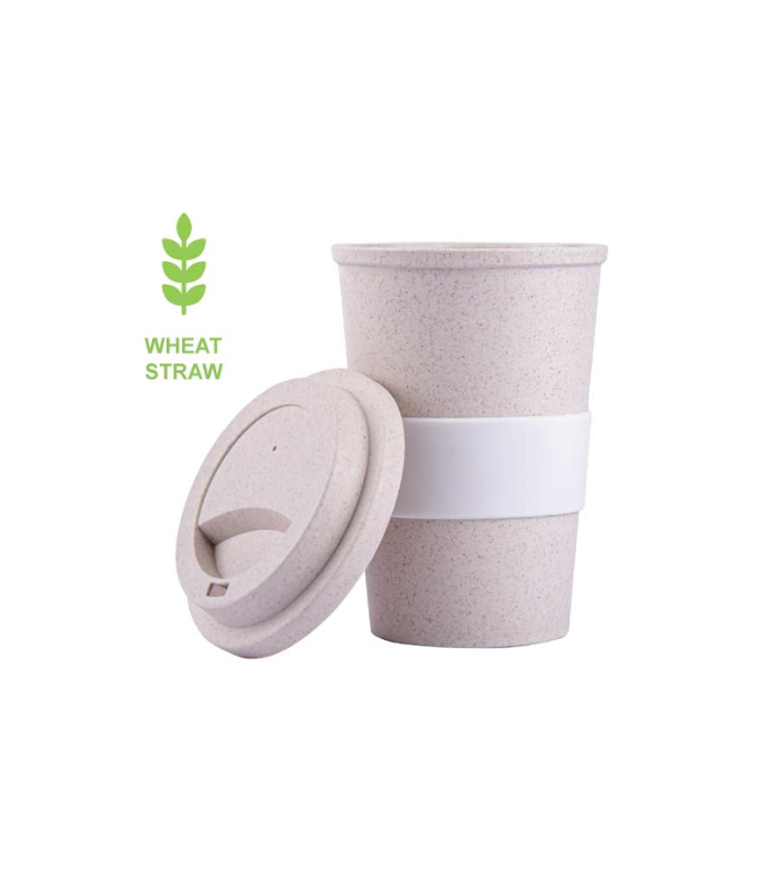 • Reusable coffee mug 380ml made from wheatstraw and silicone grip to help you hold hot liquids.