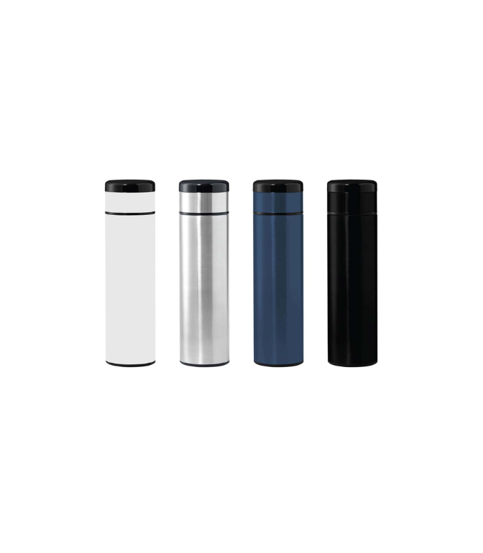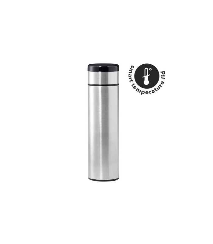 Double Walled Vacuum Insulated Temperature Display Stainless Steel Flask with 8 hours hot and 12 hours cold. The temperature indicator on the lid displays the current temperature of the liquid inside. Contains replaceable button battery. Capacity: 450ml