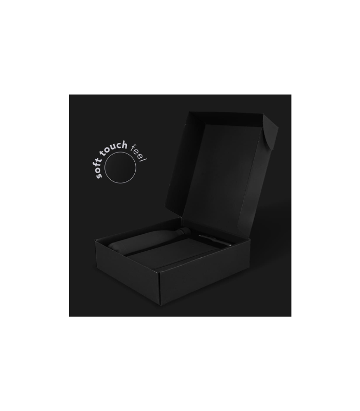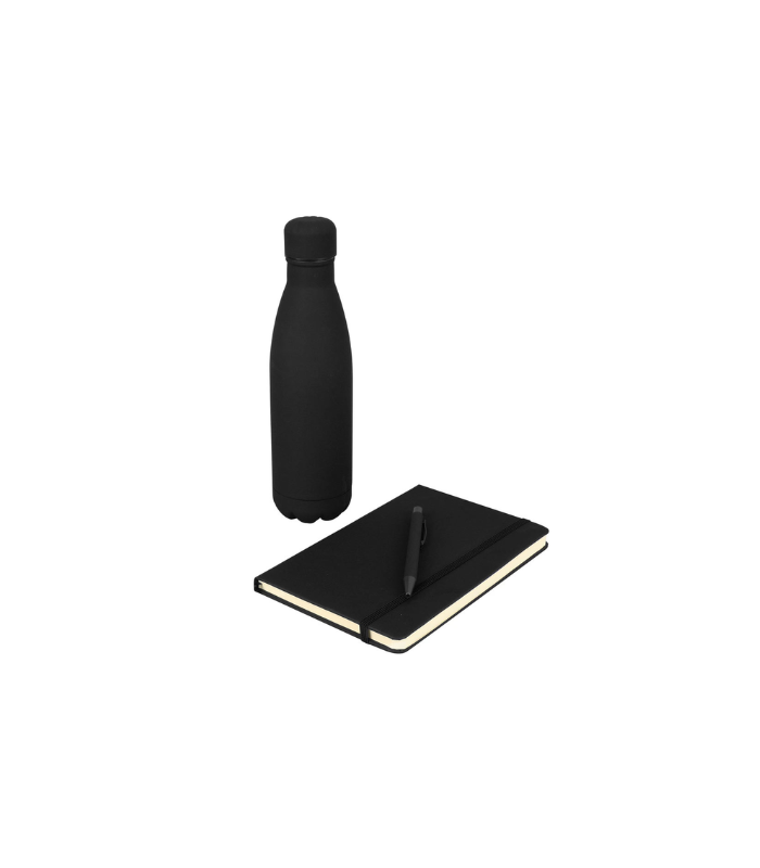Gift set containing vacuum water bottle, pen and notebook – with matching color and premium soft touch feel.