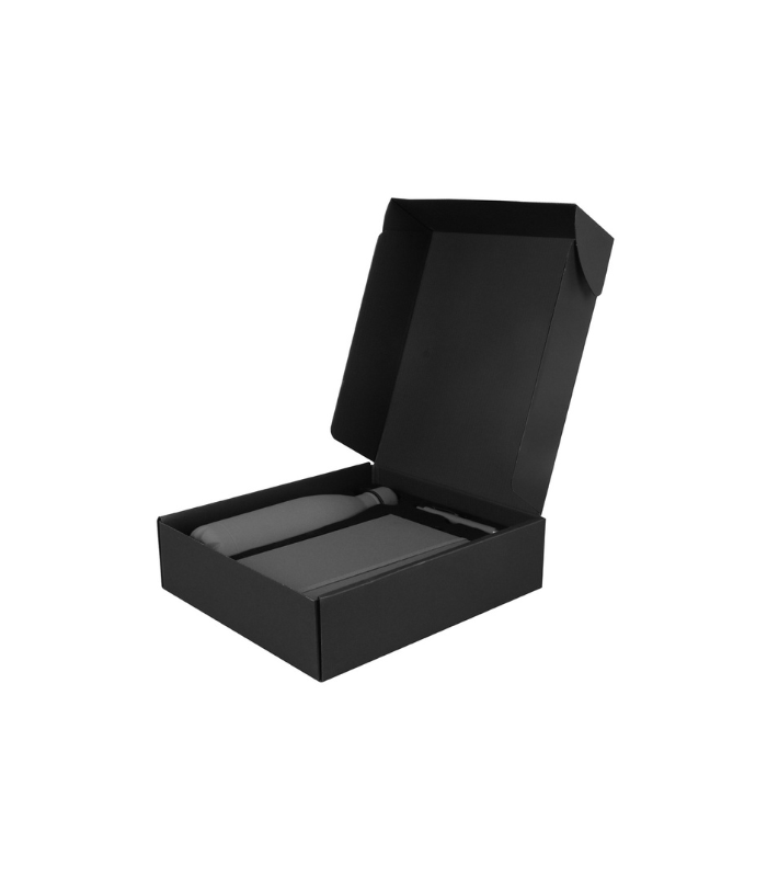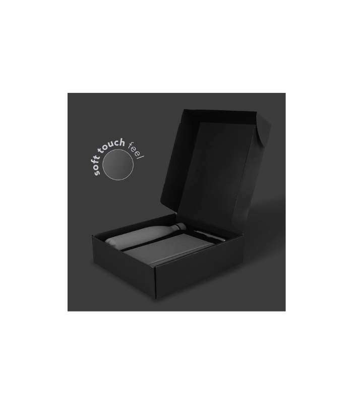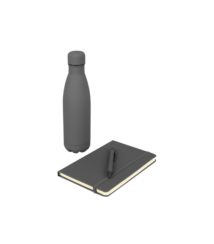 Gift set containing vacuum water bottle, pen and notebook – with matching color and premium soft touch feel.