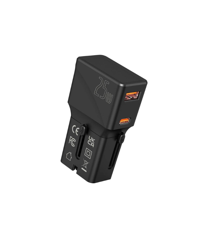 This pocket travel USB charger is a compact and travel-friendly solution for keeping your devices charged on the go. Featuring US, UK, AUS and EU input charging pins, and USB-C and USB-A outputs with fast-charging capabilities up to 25W and dual-port charging up to 15W, it supports a wide range of devices. CE, FCC, and UKCA certified, it offers safe, reliable performance in a portable design, perfect for travel, work, or everyday use. Packed in a gift box.