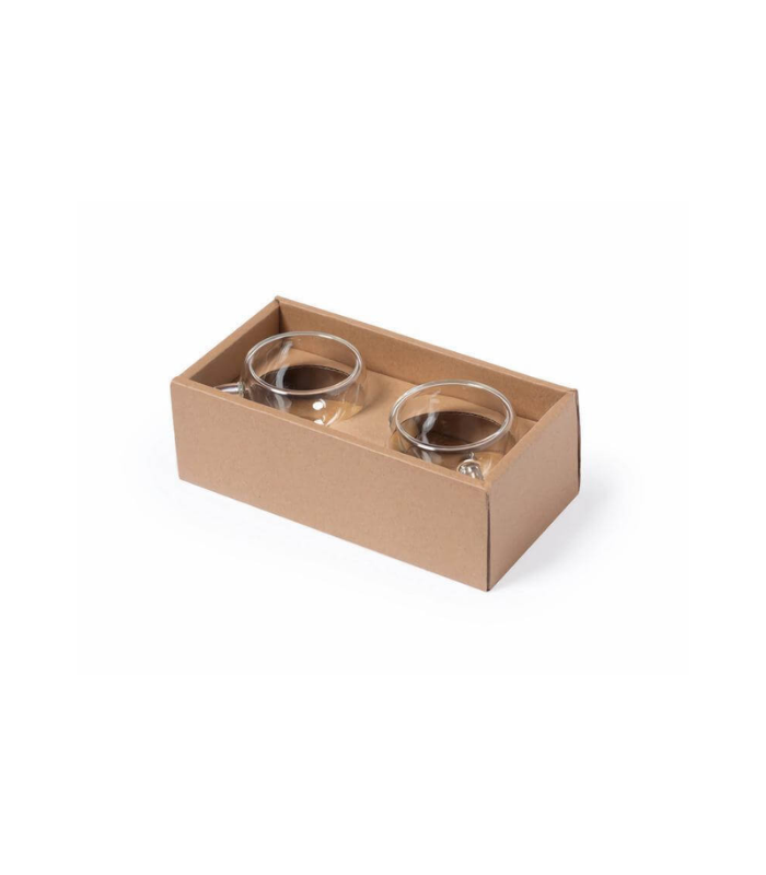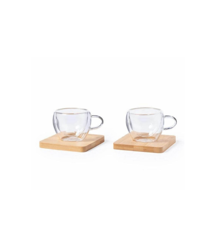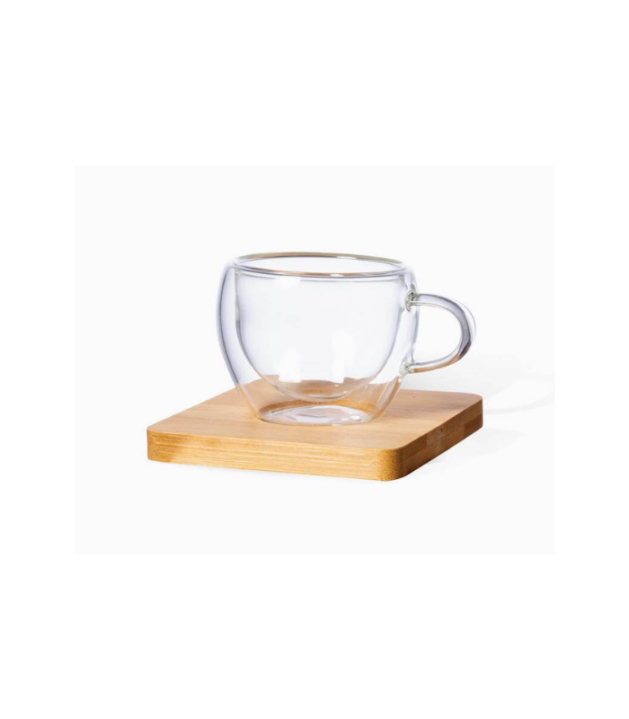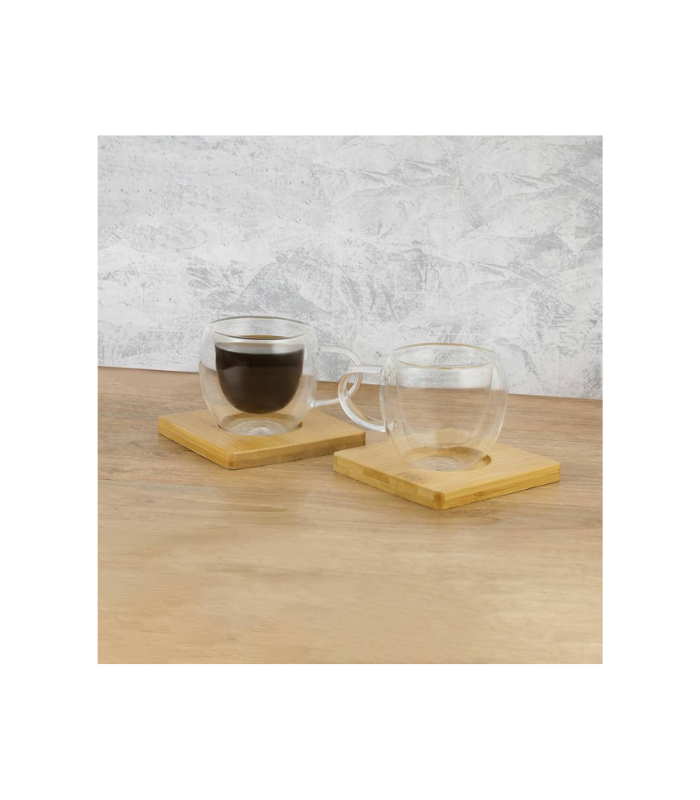 Elegant set of 2 Espresso coffee cups with 2 bamboo coasters. Coffee cups are double walled, vacuum insulated and made from borosilicate glass for good heat resistance. Each Cup has 90ml capacity, perfect size for your espresso / kahwa cravings! Packed in a gift box.