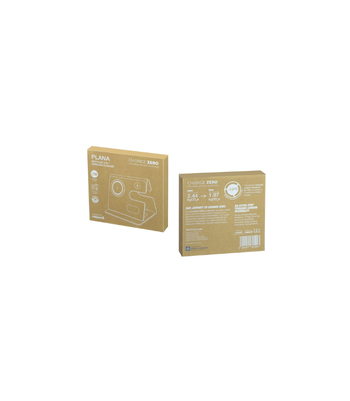 Plana is a 3-in-1 simultaneous charging station made with recycled PU and recycled ABS and featuring the latest 15W magnetic wireless charging for mobile phones, magnetic Apple Watch charger and wireless charging enabled earpods (up to 3W). All devices can simultaneously charge with a single Type C connection. Folds flat and easy to carry. Perfect gift for office and desk with a prominent branding area. Packed in a kraft gift box. This wireless charger is also a CHANGE ZERO product, which means that it is developed with a net zero carbon footprint – By using RCS-certified recycled plastic and PU, we reduce 19% carbon emissions from material use (calculated by ecoact®). Further, we offset the balance 1.97 kgCO2eq per unit by financing renewal energy projects through Climate Partner, making it a carbon-zero product.