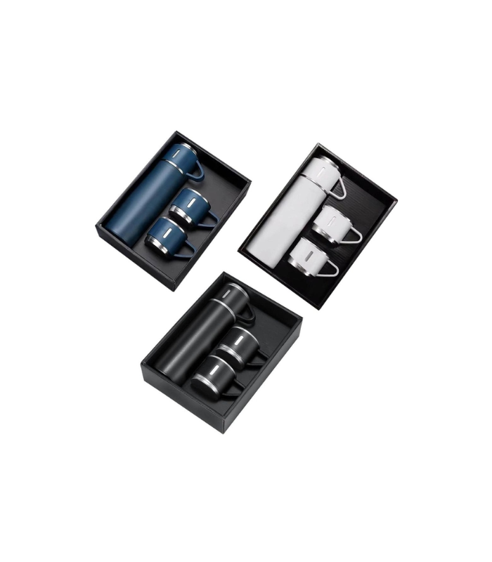 Family Gift Set of basic 500ml double-walled vacuum flask with 2 single-walled cups. Flask is leakproof, keeps drinks hot or cold and contains SS304 inside / SS201 outside. The 2 cups are 140ml each, lightweight with handle and made from SS304. Box packing.
