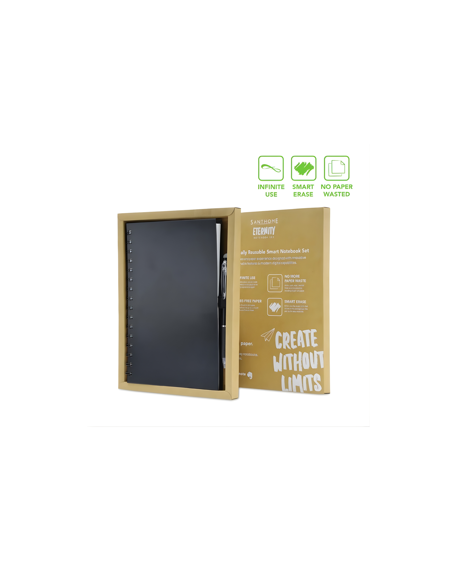 Explore eternal writing with the Santhome Eternity Notebook & Pen Set. Perfect for students and professionals who want to be more organized by combining handwritten notes with digital technology. Santhome Eternity includes a spiral notebook made from special erasable paper and a Santhome erasable pen for a smooth writing experience. Once all pages are used, use the Evernotes app to scan/organize important notes. Now, the magic happens! With the moistened cloth included, you can easily erase your notes endlessly to continue reusing your notebook, as good as new. Make a sustainable choice with reusable tree-free notebooks, and never throw another notebook away. Packed in an eco-friendly kraft paper gift box.