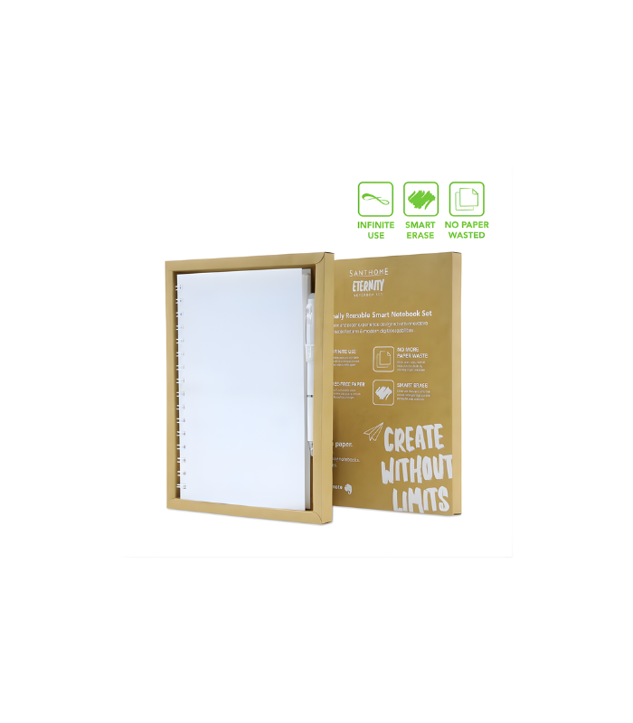Explore eternal writing with the Santhome Eternity Notebook & Pen Set. Perfect for students and professionals who want to be more organized by combining handwritten notes with digital technology. Santhome Eternity includes a spiral notebook made from special erasable paper and a Santhome erasable pen for a smooth writing experience. Once all pages are used, use the Evernotes app to scan/organize important notes. Now, the magic happens! With the moistened cloth included, you can easily erase your notes endlessly to continue reusing your notebook, as good as new. Make a sustainable choice with reusable tree-free notebooks, and never throw another notebook away. Packed in an eco-friendly kraft paper gift box.