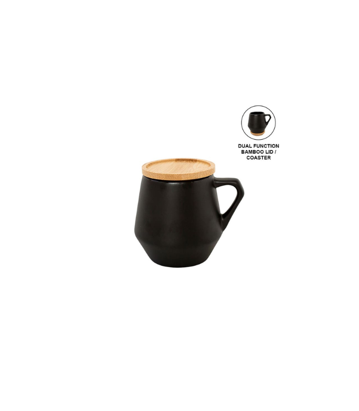 Stylish matt-finish ceramic mug with dual function bamboo lid/coaster. The lid can double up as a coaster for the mug. Dishwasher safe. Capacity: 300ml. Packed in a kraft gift box