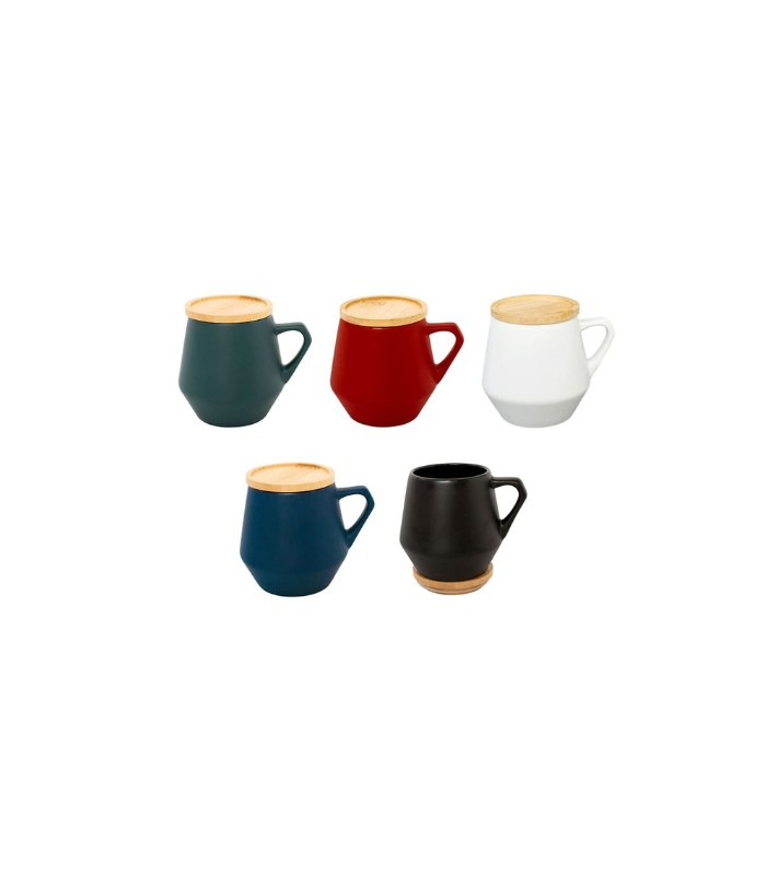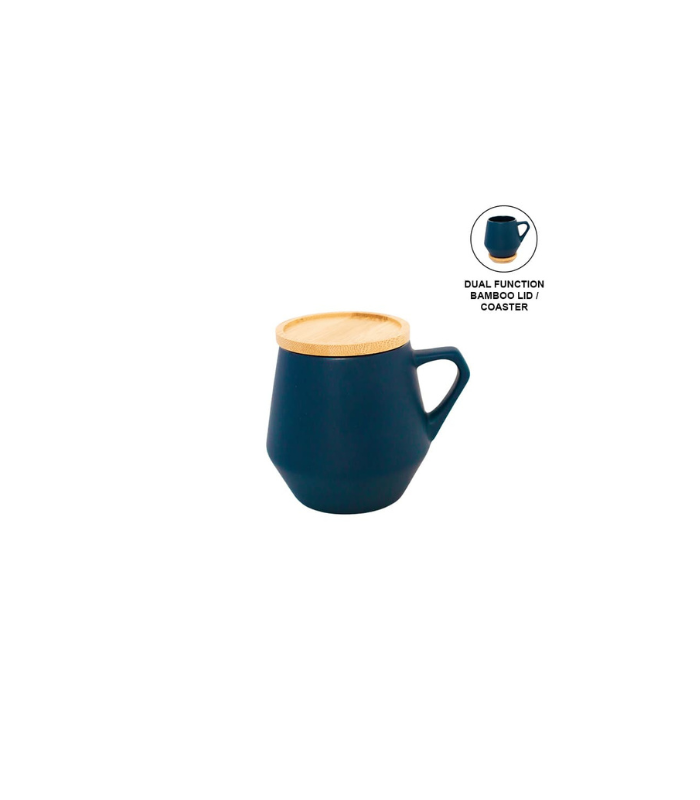 Stylish matt-finish ceramic mug with dual function bamboo lid/coaster. The lid can double up as a coaster for the mug. Dishwasher safe. Capacity: 300ml. Packed in a kraft gift box