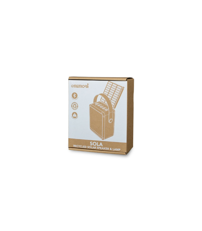 SOLA – @memorii RCS-Certified Recycled Solar Speaker & Lamp is a powerful 10W Bluetooth Speaker and LED Lamp made from RCS-certified recycled plastic and comes with an integrated, adjustable high quality monocrystalline solar panel. The battery is 1500mAh and can be charged with cable or using solar panel with 8-9 hours of strong sunlight. Once fully charged, the bluetooth speaker has 6-8 hours of continuous playtime. With mic and pick up function to answer calls. Total recycled content: 29% based on total item weight. RCS certification ensures a completely certified supply chain of the recycled materials. Sola is also water-resistant with IPX5 rating. Packed in a FSC-certified gift box.