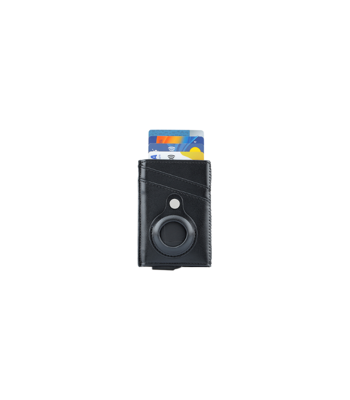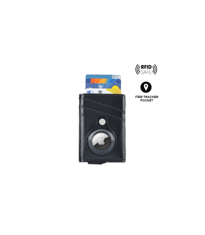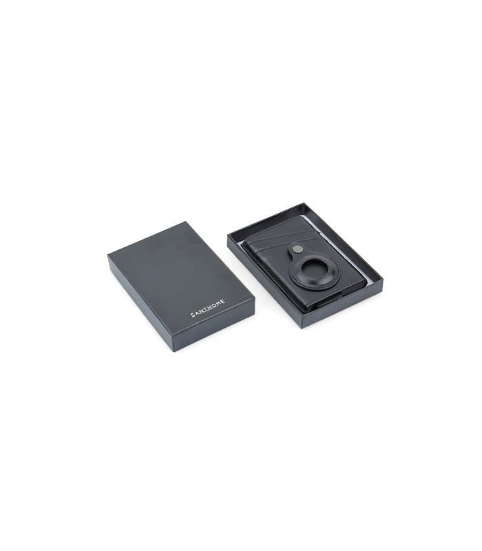Contemporary, durable and high-quality RFID cardholder with Santhome Tag / Airtag pocket. The holder has a sliding mechanism and fits 5 cards in the case with anti-skimming RFID technology. Additional pockets outside help fit 4 additional cards, so total 9 cards can be carried at once. Pocket is suited to fit Apple Airtag or Santhome Tag that can track your card wallet worldwide so you never lose your credit and ID cards again. Packed in a gift box.