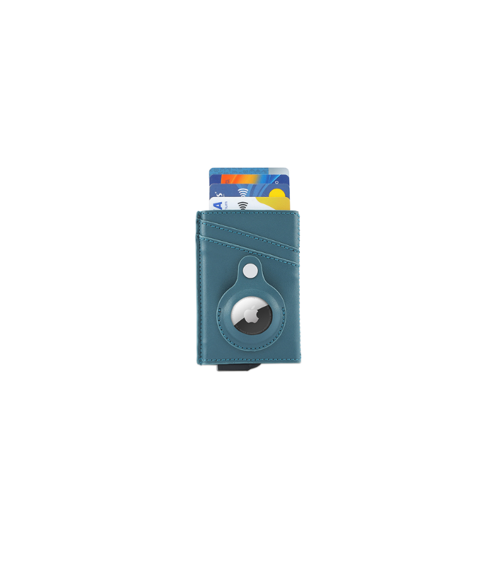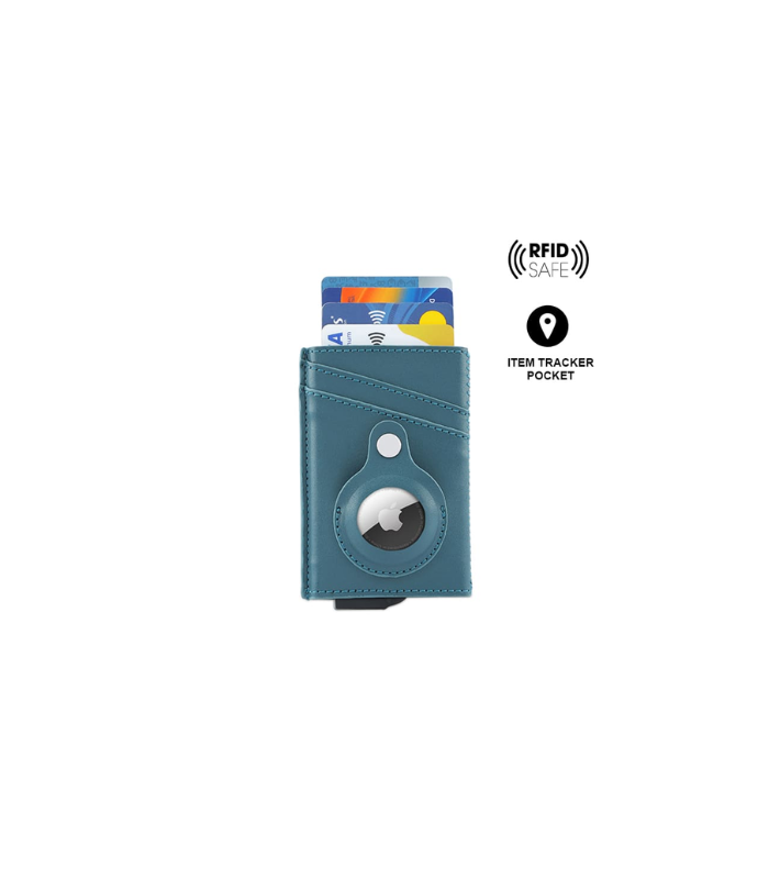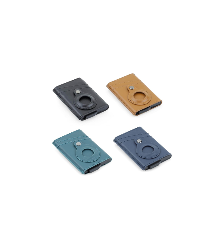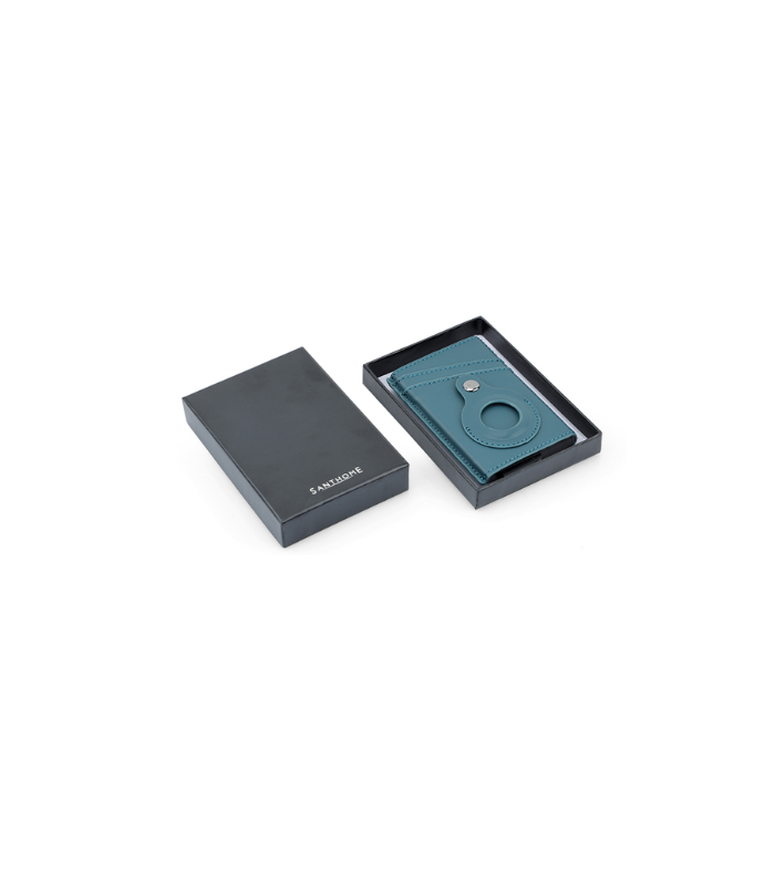 Contemporary, durable and high-quality RFID cardholder with Santhome Tag / Airtag pocket. The holder has a sliding mechanism and fits 5 cards in the case with anti-skimming RFID technology. Additional pockets outside help fit 4 additional cards, so total 9 cards can be carried at once. Pocket is suited to fit Apple Airtag or Santhome Tag that can track your card wallet worldwide so you never lose your credit and ID cards again. Packed in a gift box